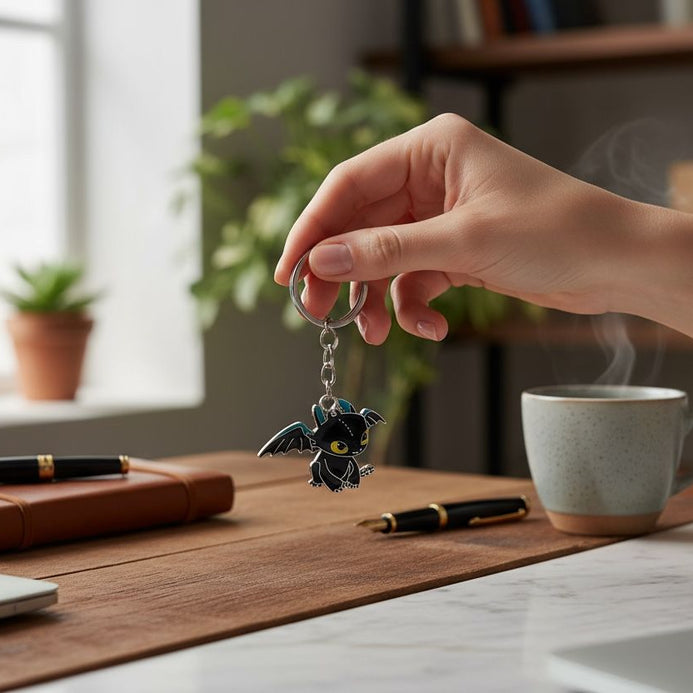 Llavero temático de Chimuelo, el adorable dragón de la película "Cómo Entrenar a Tu Dragón". Perfecto para fans de todas las edades que desean llevar consigo a su personaje favorito. Ideal como accesorio diario, regalo para coleccionistas o detalle especial para amantes de las películas de aventura. Mantén tus llaves organizadas con estilo y nostalgia.