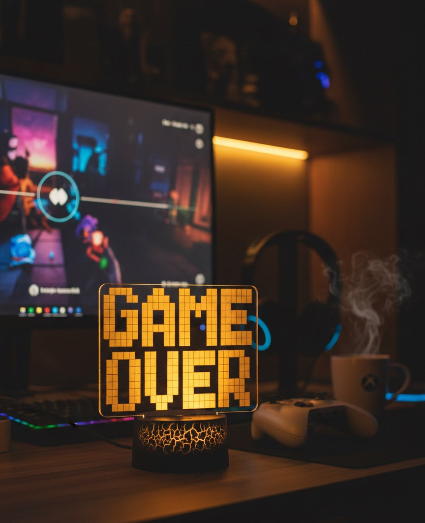 Transforma tu espacio con esta lámpara neon 3D que exhibe el legendario mensaje "Game Over". Fabricada con tecnología neon de última generación, ofrece un brillo intenso y colores vibrantes que evocan la nostalgia de los videojuegos clásicos. Ideal para decorar habitaciones, salas de juegos o espacios temáticos. Su diseño tridimensional crea profundidad y movimiento visual. Un accesorio imprescindible para gamers, coleccionistas y amantes de la cultura pop.