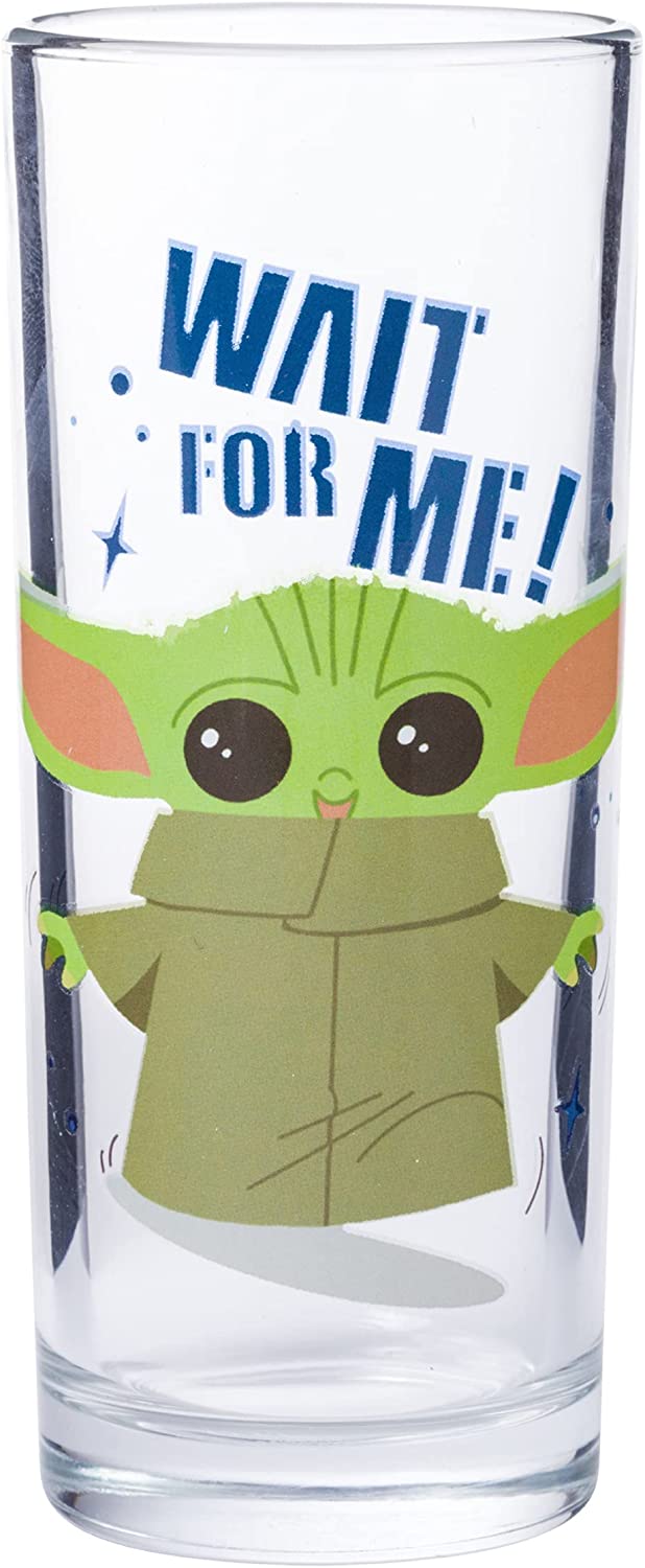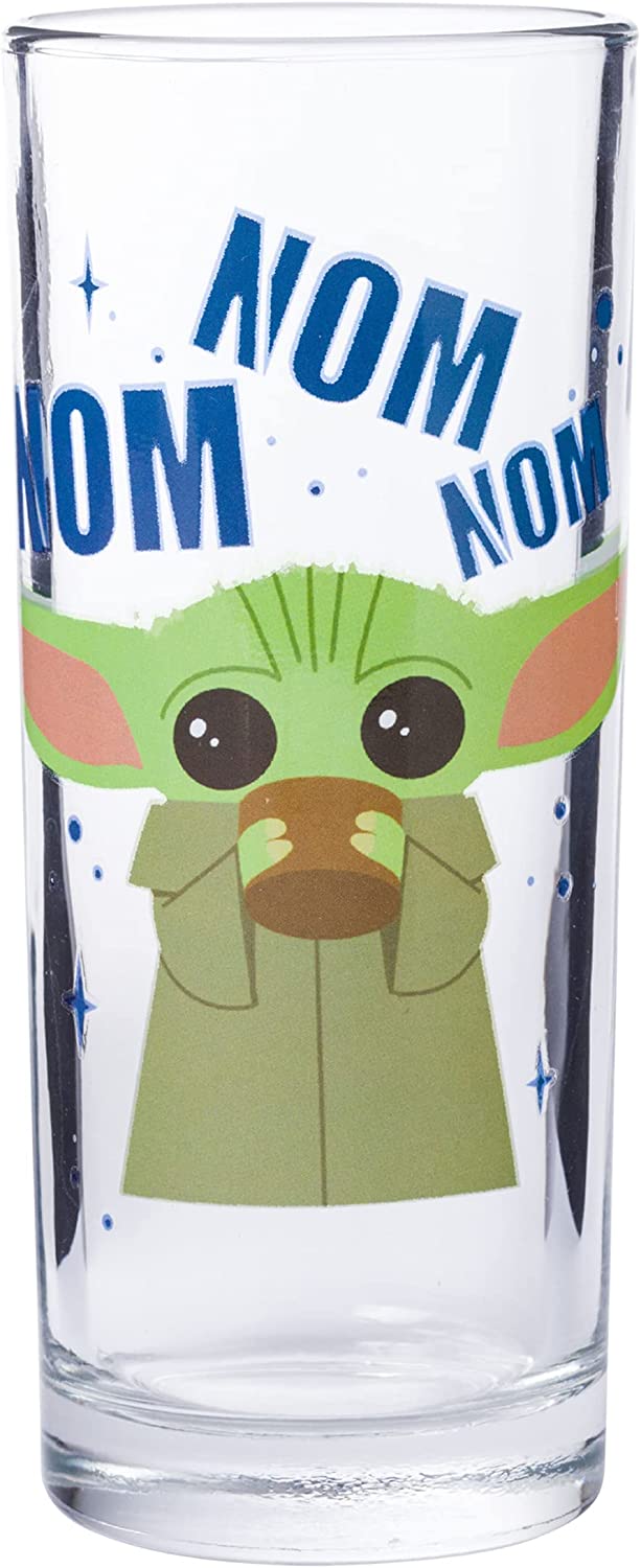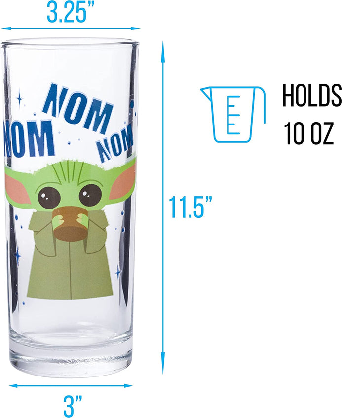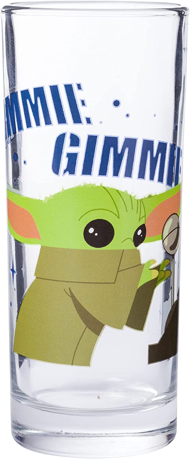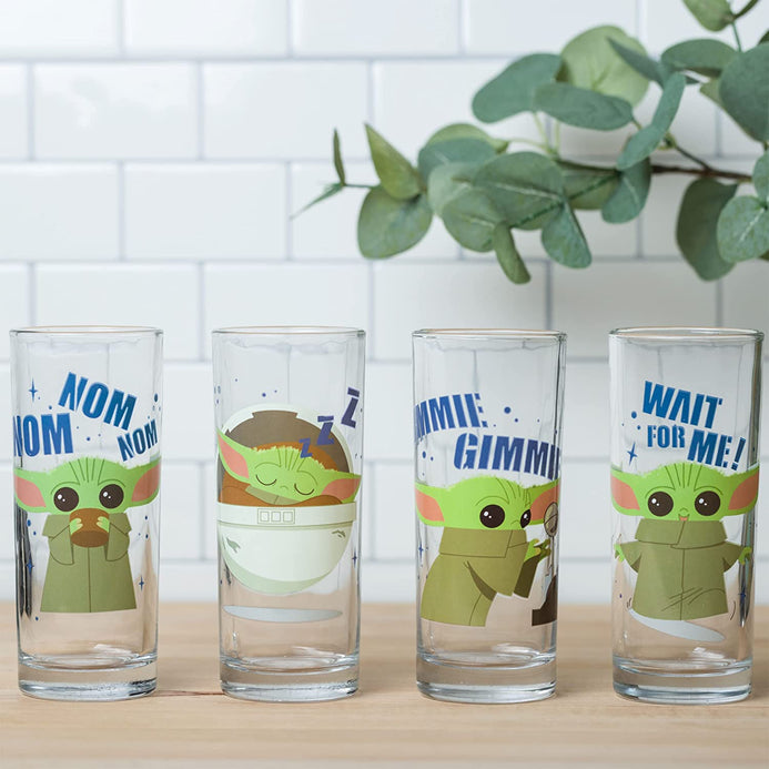 - Juego de vasos de vaso: nuestro juego de vasos contiene cuatro vasos de 10 onzas que cuentan con The Child o Grogu, con el texto ""Gimmie Gimmie,"" ""Wait for Me", ""Zzz", "" y "Nom, Nom, Nom.""