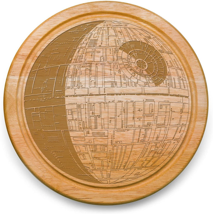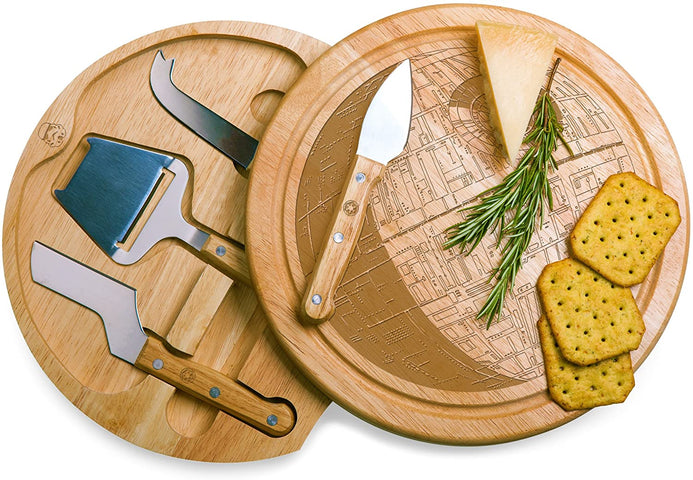 La tabla de queso Picnic Time Original Death Star Circo, una tabla de cortar de dos niveles hecha de madera de caucho sostenible con un diseño giratorio que se abre para revelar cuatro herramientas de queso de acero inoxidable cepillado a continuación, incluyendo: escobilla de queso desmenuzable, cepilladora de queso para rebanadas de queso semiduro, cuchillo de queso con punta de tenedor y cuchillo de queso duro. Una ranura de jugo empotrada alrededor del perímetro captura salmuera de queso o jugo de fruta cortada, lo que permite servir sin costuras y ordenadas. Este juego de tablas de queso único y compacto cuenta con un detallado gráfico grabado de la estrella de la muerte en la parte superior de la tabla de cortar, que seguramente será una pieza de conversación en tu próxima cena. ¡Qué regalo increíble para los entusiastas de Star Wars!
