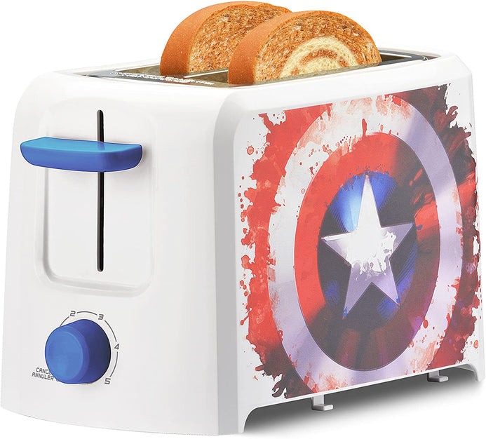 Comience la mañana con una comida heroica. La tostadora Captain America de 2 rebanadas es imprescindible para cualquier fanático de los cómics o superhéroes. La tostadora imprime el escudo icónico en cada rebanada. Las ranuras anchas y las guías autocentrantes permiten tostar muchos tipos de pan.