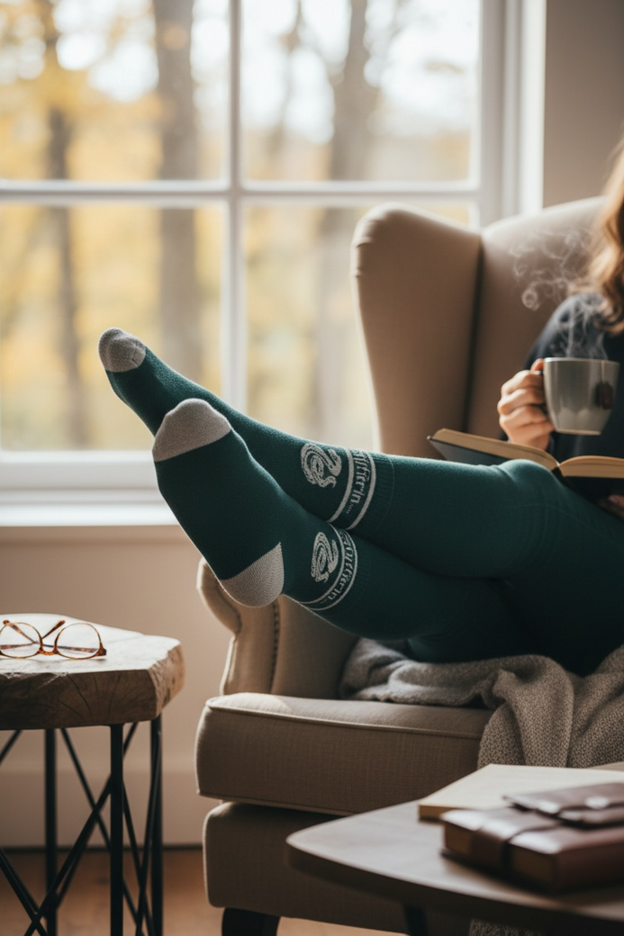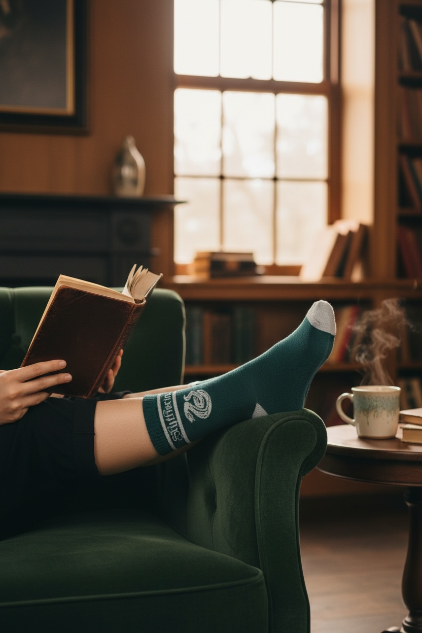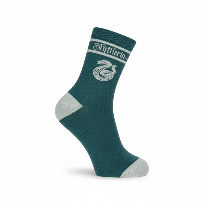 # Medias Slytherin Viste tus pies con el orgullo de la casa más astuta de Hogwarts. Estas medias Slytherin combinan el icónico verde y plata con un diseño que celebra la elegancia y el ingenio de la serpiente. Perfectas para fans dedicados que desean llevar su pasión por Harry Potter en cada paso. Cómodas, duraderas y diseñadas para destacar, son el complemento ideal para cualquier outfit de bruja o mago.