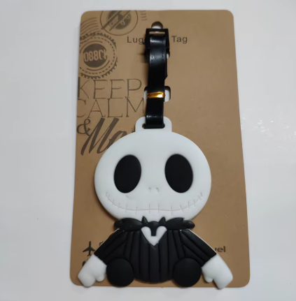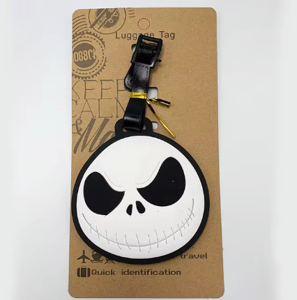 Etiqueta para maleta con diseño de Jack Skeleton. Identifica fácilmente tu equipaje mientras muestras tu amor por el clásico de Tim Burton. Duradera y resistente, esta etiqueta hace que viajar sea más divertido. ¡No te preocupes por perder tu maleta con esta etiqueta única!