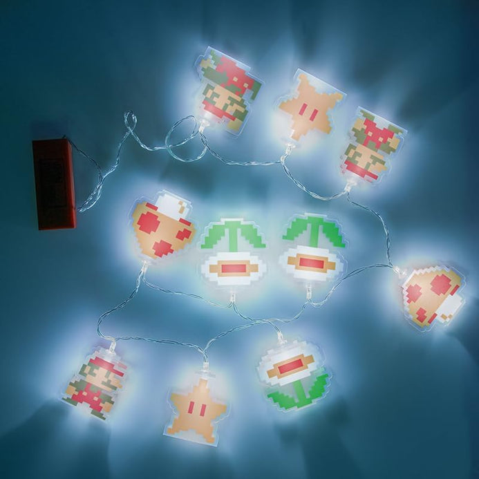 - Cadena de luces con 10 LED: ilumina tu espacio con 10 LED vibrantes, cada uno representando elementos clásicos de Super Mario. Ideal para los videojugadores, estas luces de personajes seguramente despertarán nostalgia y conversaciones.
