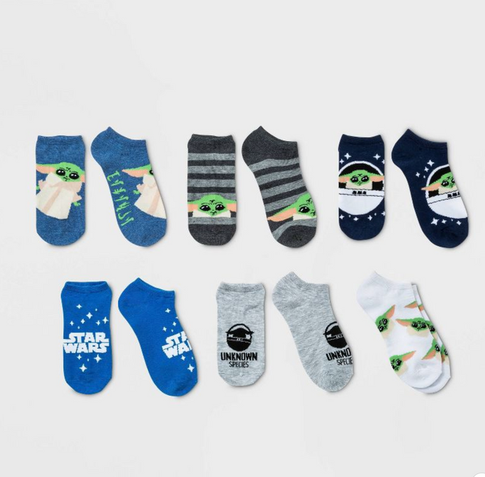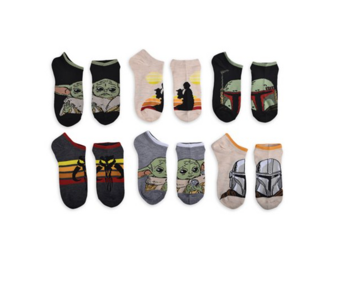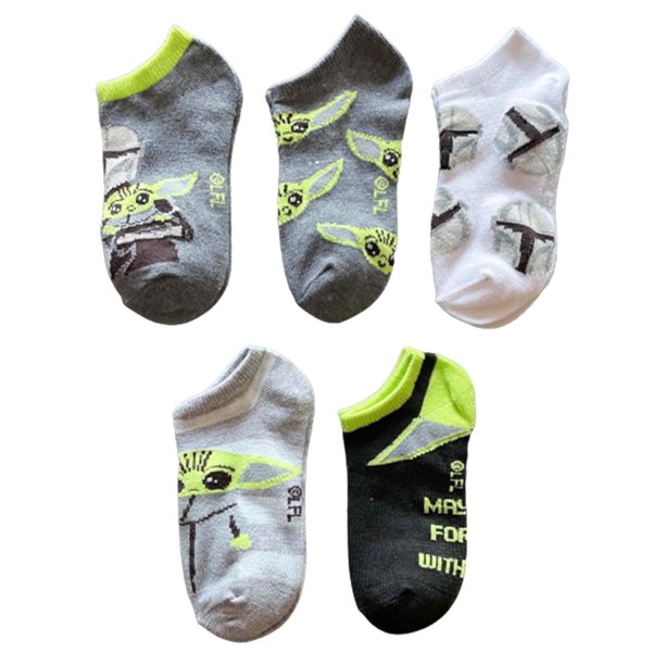 Agregue intriga y misterio de la Fuerza intergaláctica a su colección de calcetines con los calcetines Star Wars Baby Yoda. Este paquete de calcetines para niños incluye seis pares de calcetines invisibles con un esquema de colores vibrantes de azul, azul marino, gris y blanco, y adornados con una variedad de diseños divertidos y emocionantes de la serie épica, que van desde estampados y siluetas de Baby Yoda hasta el logotipo de Star Wars y el estampado de estrellas, lo que les permite mostrar su fanatismo con un estilo lindo. Confeccionados con una tela suave y duradera con un toque de spandex para mayor comodidad y un uso flexible, cada par también está terminado con puños de punto acanalado que ayudan a evitar que los calcetines se amontonen y rueden debajo de los pies.