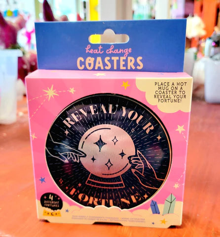 ¡Revela tu fortuna con este juego de cuatro posavasos! Reaccionan al calor para revelar tu fortuna. Simplemente coloque una bebida caliente en una taza encima del posavasos.