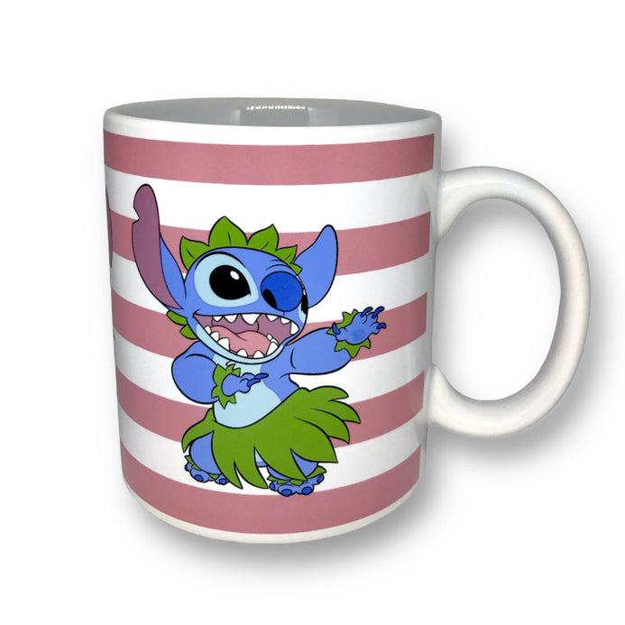 - La taza es blanca con lineas rosadas y presenta a Stitch en 3 versiones distintas con estilo playero.