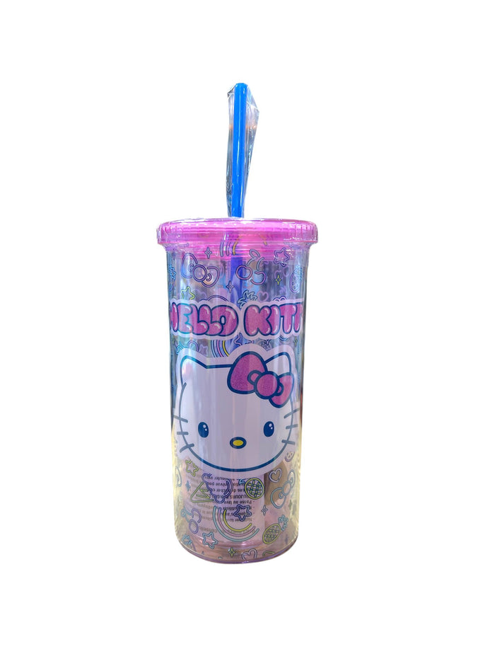Disfruta de tus bebidas favoritas con este vaso decorado con un carrizo, adornado con motivos de Hello Kitty, arcoíris, frutas y lazos. Perfecto para niños y fans de Hello Kitty, combina funcionalidad y un diseño alegre que hará cada sorbo más divertido. Ideal para uso diario o como regalo encantador.