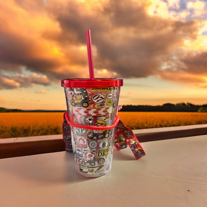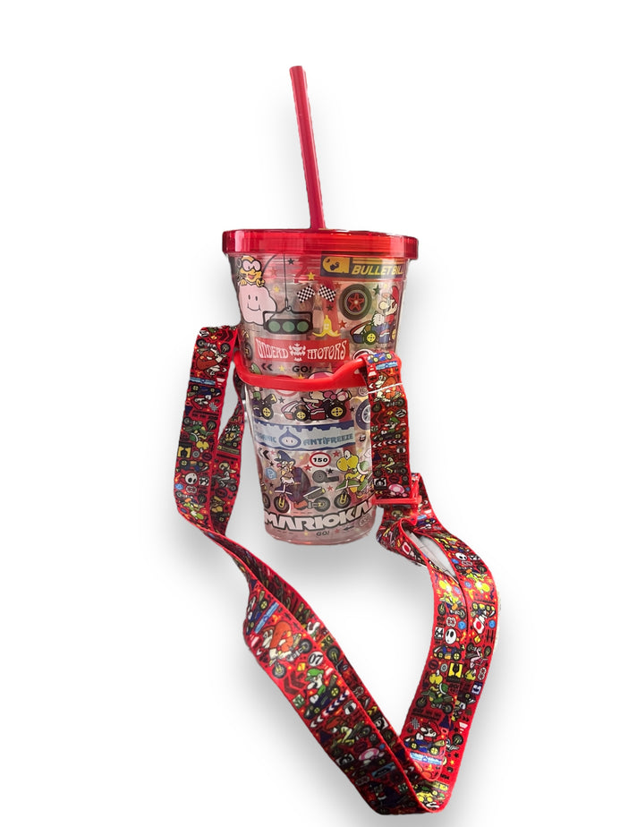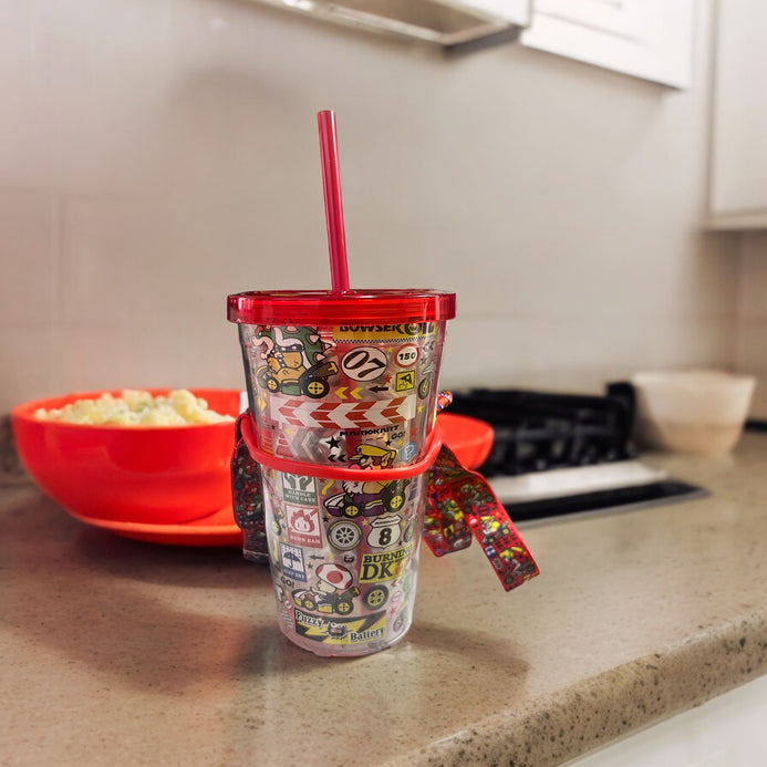 Este vaso de vidrio con diseño de Mario viene con una tapa de carrizo y una cinta para sujetarlo. Ideal para llevar tu bebida favorita a donde quieras sin derrames. Una forma divertida y práctica de mantener tu hidratación.