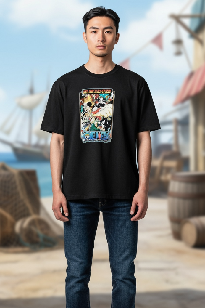 Esta franela suéter negra combina la comodidad de una camiseta con el estilo de un suéter, ideal para un look casual y moderno. Su diseño inspirado en One Piece aporta un toque único y original, perfecto para los fanáticos de la serie. Fabricada con materiales suaves, ofrece confort durante todo el día.