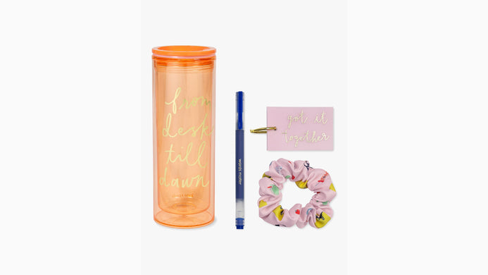 - el juego incluye: taza acrílica de 16 oz; bolígrafo de plástico con tinta de gel; coletero de poliéster/elástico; 80 tarjetas de papel sin renglones con cubierta de plástico y anillo de metal