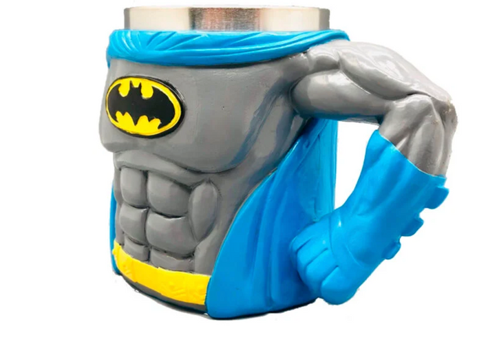 Disfruta tu bebida con poder de superhéroe. Esta taza de Batman, fabricada en aluminio y resina, presenta el diseño único de su brazo levantado, listo para la acción. Ligera, duradera y perfecta para los fanáticos del Caballero Oscuro. Ideal para tu café o como pieza de colección.