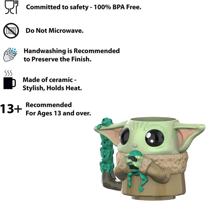 - Pintada a mano: la taza esculpida de Baby Yoda está pintada a mano y hecha de cerámica, por lo que mantiene el calor bien para mantener las bebidas calientes. Se recomienda lavar a mano para preservar el acabado. No apto para microondas.