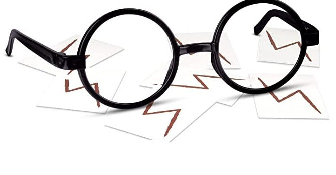 - Buenos materiales: gafas de mago hechas de plástico; recordatorio rey: si recibes las gafas, las gafas se caerán y simplemente las instalarán; tatuajes temporales de rayo con material no tóxico, no te preocupes por la alergia a la piel y fáciles de quitar