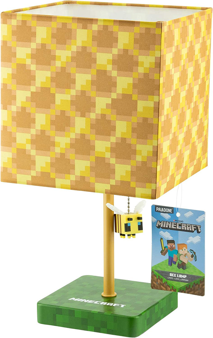 - Detalles: esta lámpara LED Minecraft Bee es de 35 cm de alto con una pantalla de tela, una base de metal y una cadena con forma de abeja. La lámpara se conecta a la pared y las bombillas no están incluidas.