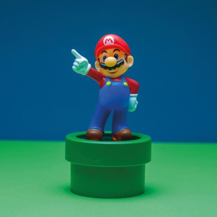 La luz de 20 cm (7,9") de alto está inspirada en el icónico héroe bigotudo. Presiona a Mario hacia abajo para encender y apagar la luz. Muestra al famoso fontanero en los estantes de tu sala de estar o como luz de noche en tu dormitorio.