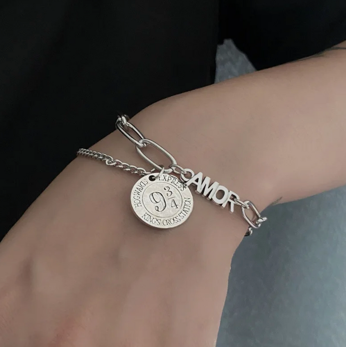 Mejora tu estilo con nuestra pulsera plateada de Harry Potter. Con un diseño único inspirado en la plataforma 9 3/4, esta pulsera es perfecta para los amantes de la saga. , es un accesorio duradero y elegante. ¡Hazte con ella y muestra tu amor por Harry Potter!