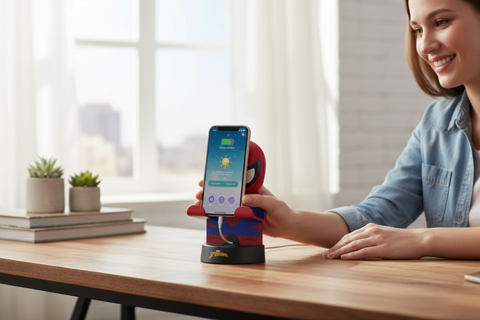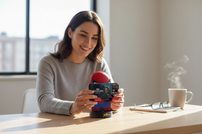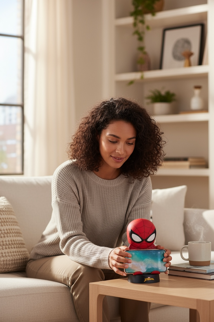 El soporte para teléfono de 13 cm (5,1") de alto es compatible con la mayoría de los teléfonos inteligentes y accesorios de carga. Spider-Man sujetará cuidadosamente tu teléfono con sus brazos mientras realizas videollamadas, miras vídeos y más, dejándote libre para realizar múltiples tareas