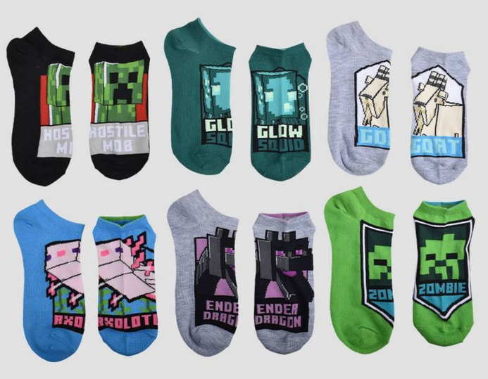 Los calcetines invisibles Minecraft 6-Pack mantendrán sus pies felices y cómodos, ya sea que estén paseando por la ciudad o aprendiendo a crear, explorar y sobrevivir en el popular videojuego. Este paquete de calcetines para niños viene con seis pares de calcetines invisibles con una variedad de diseños temáticos de Minecraft para agregar un toque animado a los estilos cotidianos. Estos calcetines vibrantes resaltan a sus personajes favoritos: Creeper, Glow Squid, Goat, Axolotl, Ender Dragon y Zombie. Confeccionados con una tela suave de peso medio con un toque de spandex para un uso cómodo, estos calcetines gráficos quedan bien escondidos dentro de los zapatos y las blusas deportivas acanaladas para mantenerlos en su lugar sin que se amontonen.