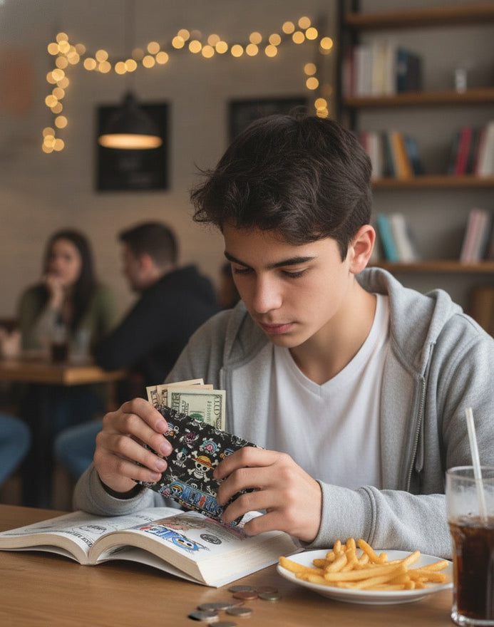 Cartera de cuero sintético inspirada en One Piece con diseño minimalista en negro. Compartimentos funcionales para tarjetas, monedas y documentos. Perfecta para fans que buscan llevar su pasión por el anime en el día a día. Durabilidad y estilo en una sola pieza.