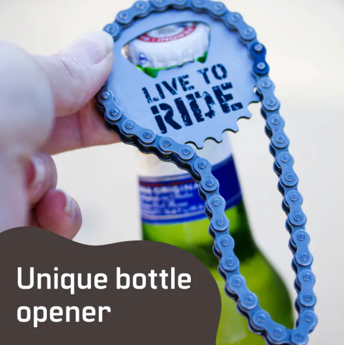 ¿Quieres impresionar a tus amigos pero Wheelies no funciona? ¡Muestre a sus amigos lo fanático de las bicicletas que realmente es con este abrebotellas de metal único con el tema de la cadena de bicicletas! Hecho de una cadena de bicicleta real con el texto que dice 'Live to ride', este pequeño y práctico brebaje seguramente hará sonreír a cualquier amante de la bicicleta. ¡Siéntese, relájese y abra una cerveza la próxima vez que vea el Tour de Francia! Un gran regalo novedoso para un fanático del ciclismo en su cumpleaños, día del padre o como un Papá Noel secreto en Navidad.