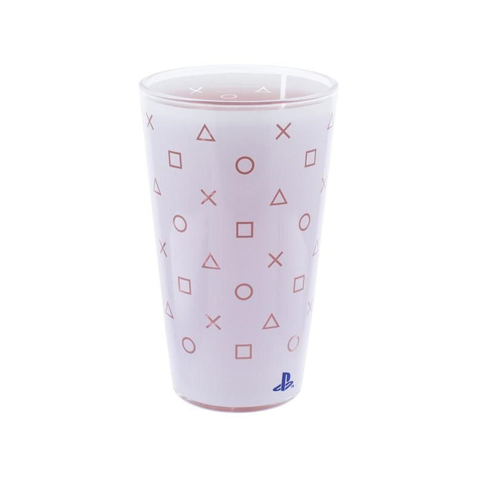 Este vaso para beber de 400 ml (14 fl oz) presenta un estampado con acabado completamente blanco con el logotipo de PlayStation en azul, además de calcomanías transparentes repetidas de los icónicos símbolos de los botones de acción (triángulo, círculo, cruz y cuadrado), que son reconocibles al instante por los jugadores de todas las edades.
