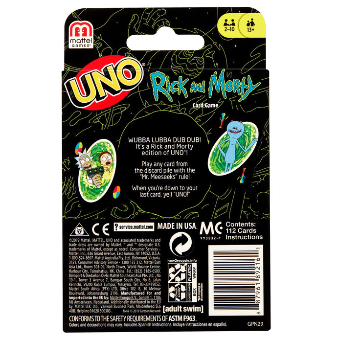 # Cartas UNO edición Rick y Morty Juega con el caos y la aventura de Rick y Morty en este set exclusivo de cartas UNO. Cada carta presenta los personajes icónicos de la serie en diseños únicos y coloridos que capturan la esencia irreverente del show. Perfecto para fans de la serie que buscan combinar diversión clásica con su pasión por Rick y Morty. Ideal para noches de juego en familia o con amigos. Un regalo imprescindible para coleccionistas y aficionados de la franquicia.