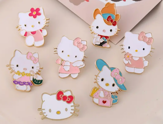 Este pin de Hello Kitty es un accesorio encantador que añade un toque divertido y adorable a cualquier prenda o mochila. Perfecto para los fans de este icónico personaje, combina estilo y personalidad en un diseño compacto y fácil de llevar. Ideal para coleccionar o regalar.
