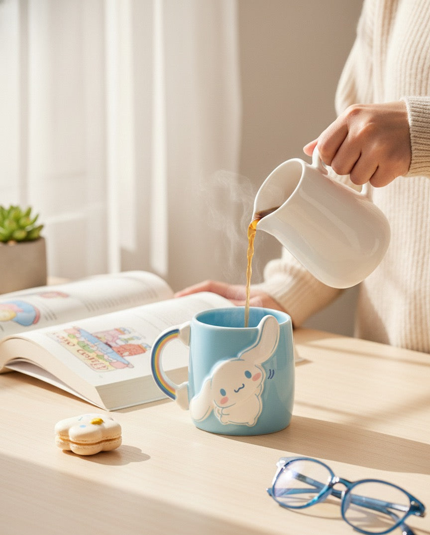 Taza de cerámica con el adorable diseño de Cinnamoroll de Sanrio en tonos arcoíris. Perfecta para disfrutar tu bebida favorita mientras celebras tu amor por este personaje icónico. Su acabado vibrante y resistente la hace ideal para el uso diario en casa u oficina. Un regalo encantador para coleccionistas y fans de Sanrio que buscan agregar un toque de magia a su rutina matutina.