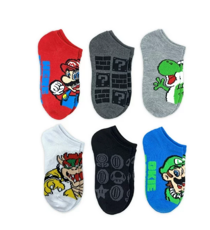 ¡Este paquete de 6 calcetines invisibles de Super Mario Boys es un adorable accesorio de moda para tu hijo! Con Mario, Luigi, Yoshi y Bowser, estos calcetines se pueden combinar con casi cualquier atuendo que elijas. Livianos y transpirables, ofrecen una comodidad superior que es perfecta para usar durante todo el día. ¡Echa un vistazo a toda la colección de calcetines invisibles de personajes