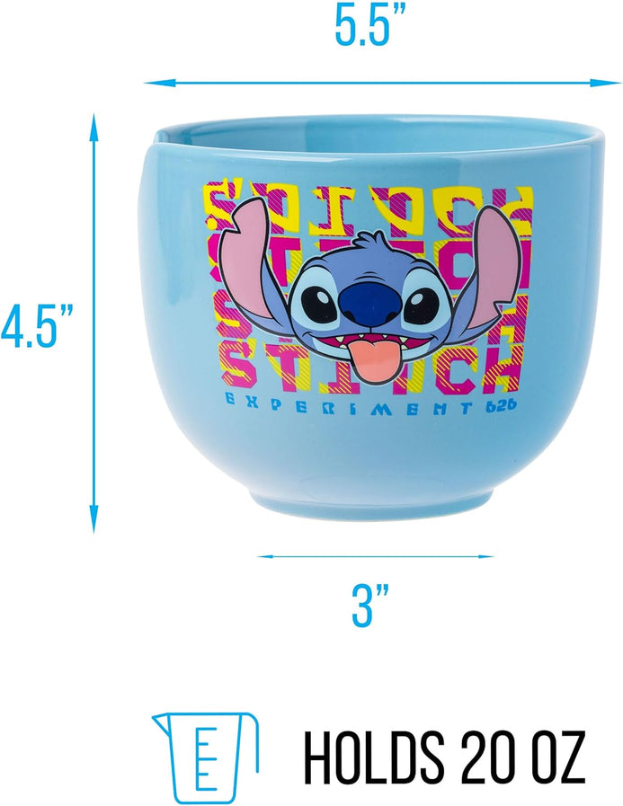 Este tazón de 20 onzas presenta un diseño exclusivo con la imagen del querido experimento 626, Stitch, listo para acompañar tus aventuras culinarias. Perfecto para los fans de Disney y de esta entrañable película, este tazón es funcional y divertido.