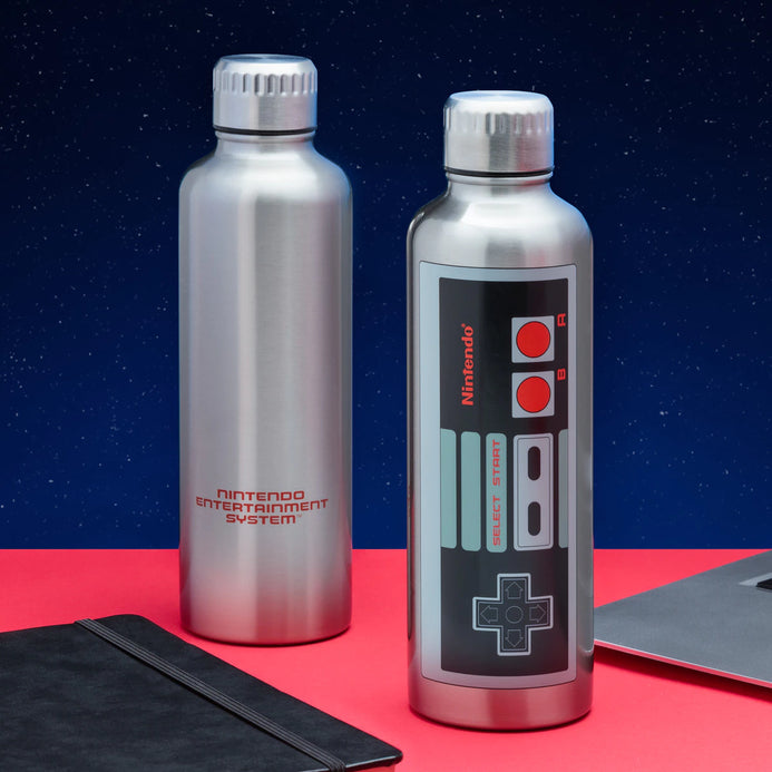 A los fanáticos de Nintendo Entertainment System (NES) les encantará el exterior cepillado fresco de esta botella de agua de acero inoxidable de doble pared. Decorado con un gráfico que recrea el diseño del controlador que estaba cableado en la NES con el logo de Nintendo Entertainment System en el reverso en rojo.