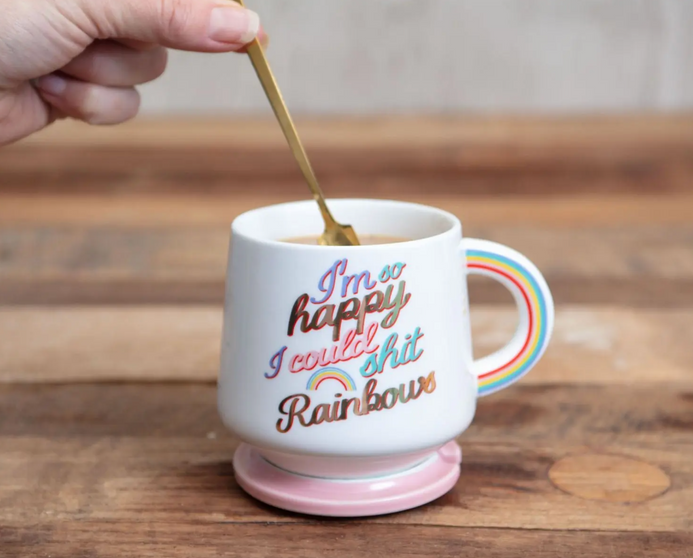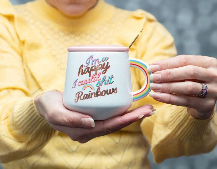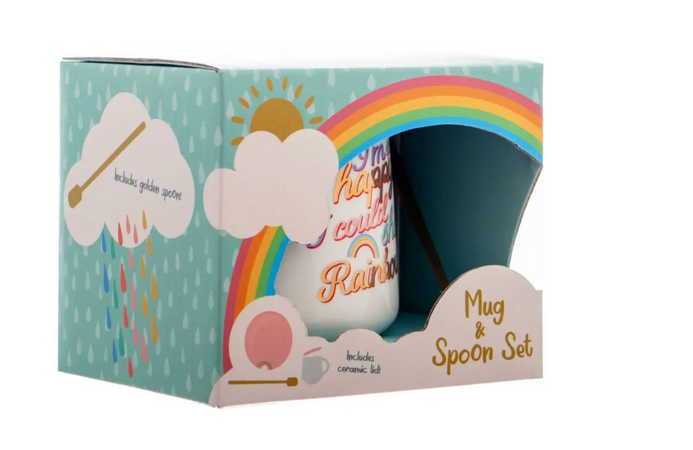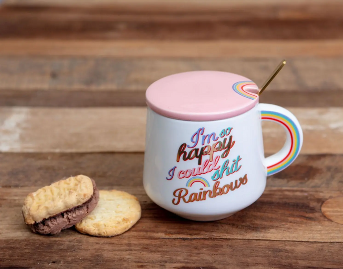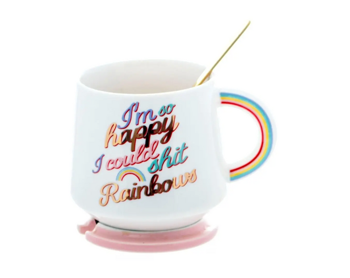 Taza Arcoiris I'm So Happy con cuchara y tapa posavaso