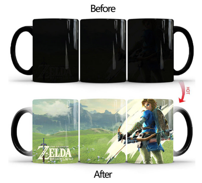 # Taza Zelda Change Color 2 Taza termosensible que cambia de color con la temperatura, inspirada en el universo de The Legend of Zelda. Disfruta de tu bebida favorita mientras observas cómo el diseño se transforma ante tus ojos. Perfecta para fans de la saga que buscan un artículo funcional y coleccionable. Ideal como regalo o para uso personal. Capacidad estándar, apta para bebidas calientes y frías.