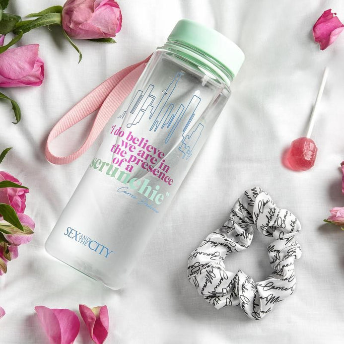 Mantente hidratado a la moda con esta botella de agua y coletero de Sex and the City.