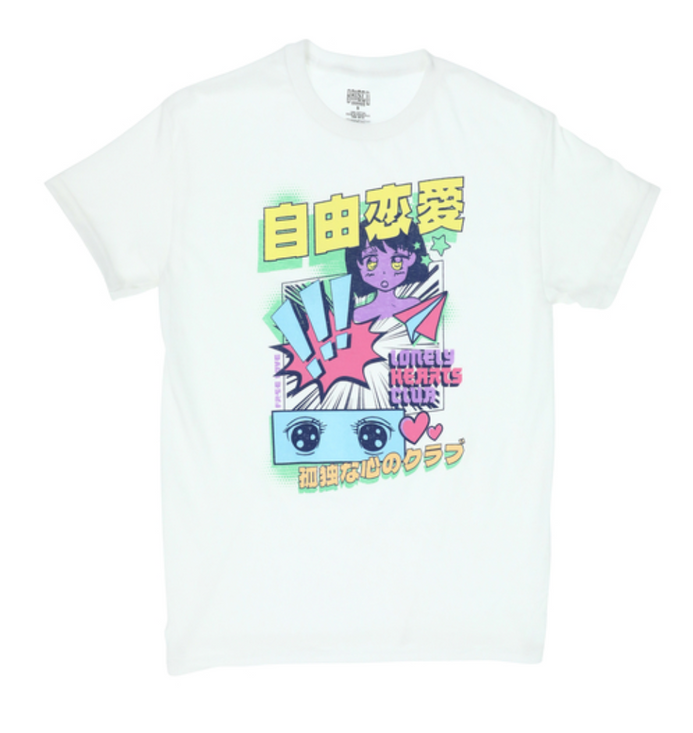 vibrar en la camiseta gráfica de anime 'lonely hearts club' es como el viaje a tokio más asequible de la historia. esta estética de anime es de clase mundial.