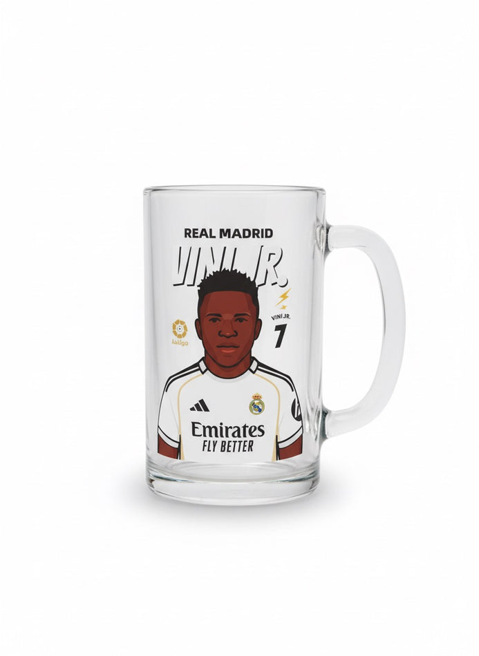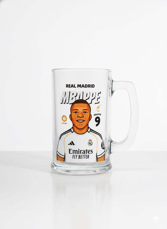 Jarra cervecera oficial con el escudo y jugadores del Real Madrid. Perfecta para disfrutar de tu bebida favorita mientras apoyas al equipo blanco. Fabricada en vidrio resistente con diseño duradero, esta jarra combina funcionalidad y pasión madridista. Ideal para coleccionistas, aficionados y como regalo para cualquier ocasión. Eleva tu experiencia de consumo con estilo merengue.
