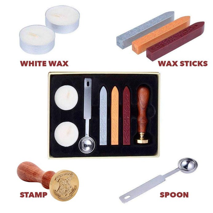 - El kit incluye: 1 exquisita caja, 1 cuchara de cera de sellado, 1 sello de madera de Harry Potter, 2 velas, 3 kits de cera de sellado de colores agradables