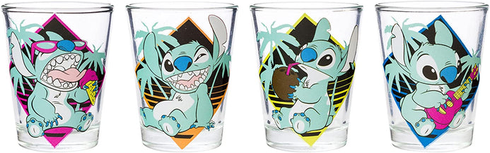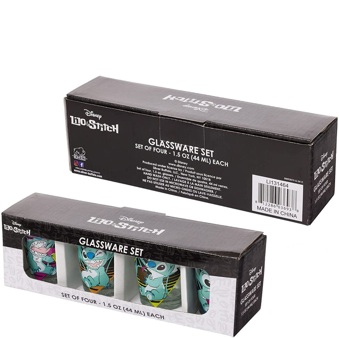 JUEGO DE VIDRIOS: Presenta ilustraciones de Lilo y Stitch de Disney, con texto que dice "Ohana significa familia". Este mini juego de 4 vasos de 1.5 oz presenta a Lilo y Stitch de Disney.