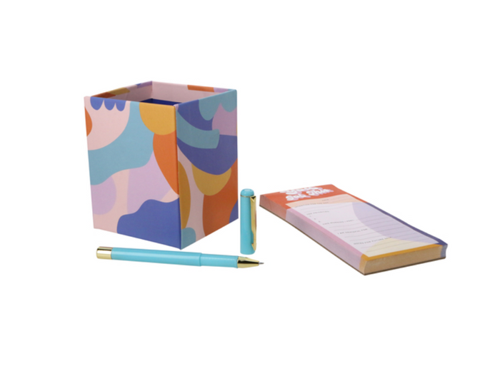elementos incluidos: portalápices, bloc de notas y bolígrafo a juego